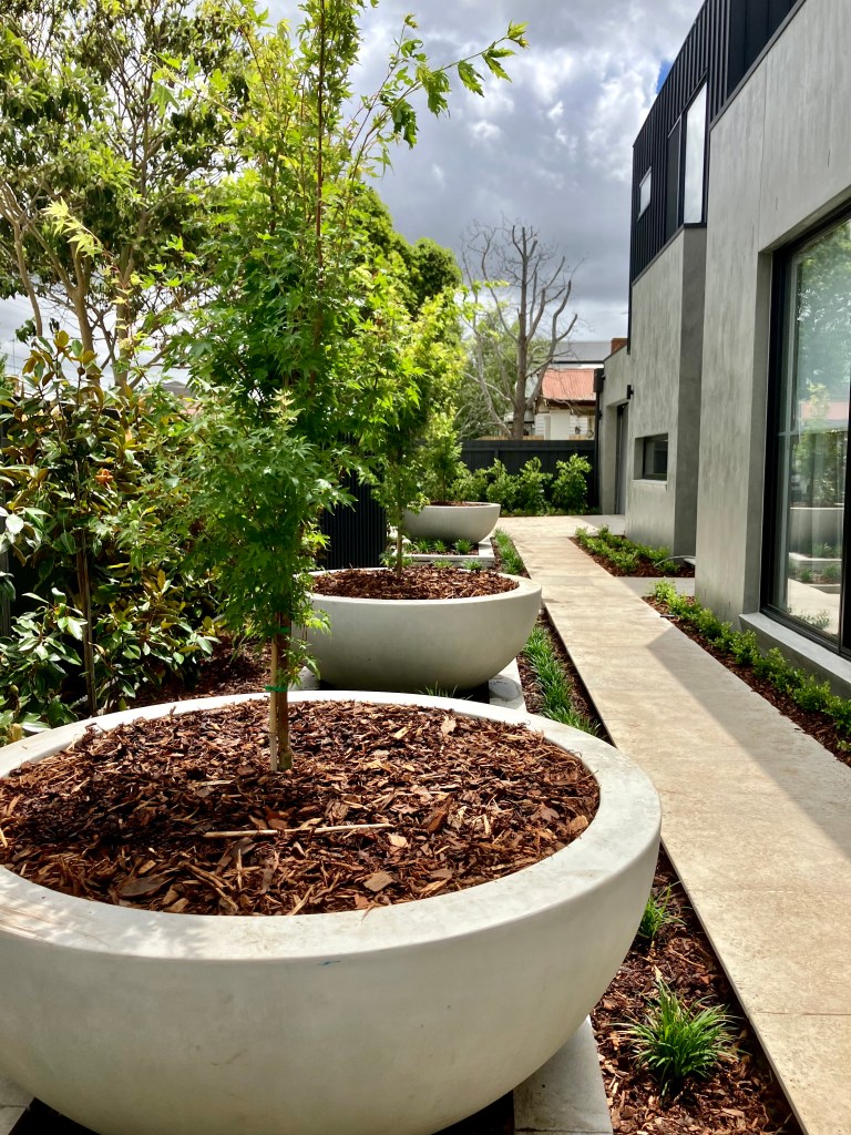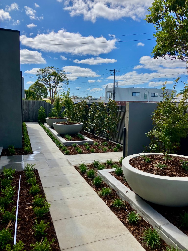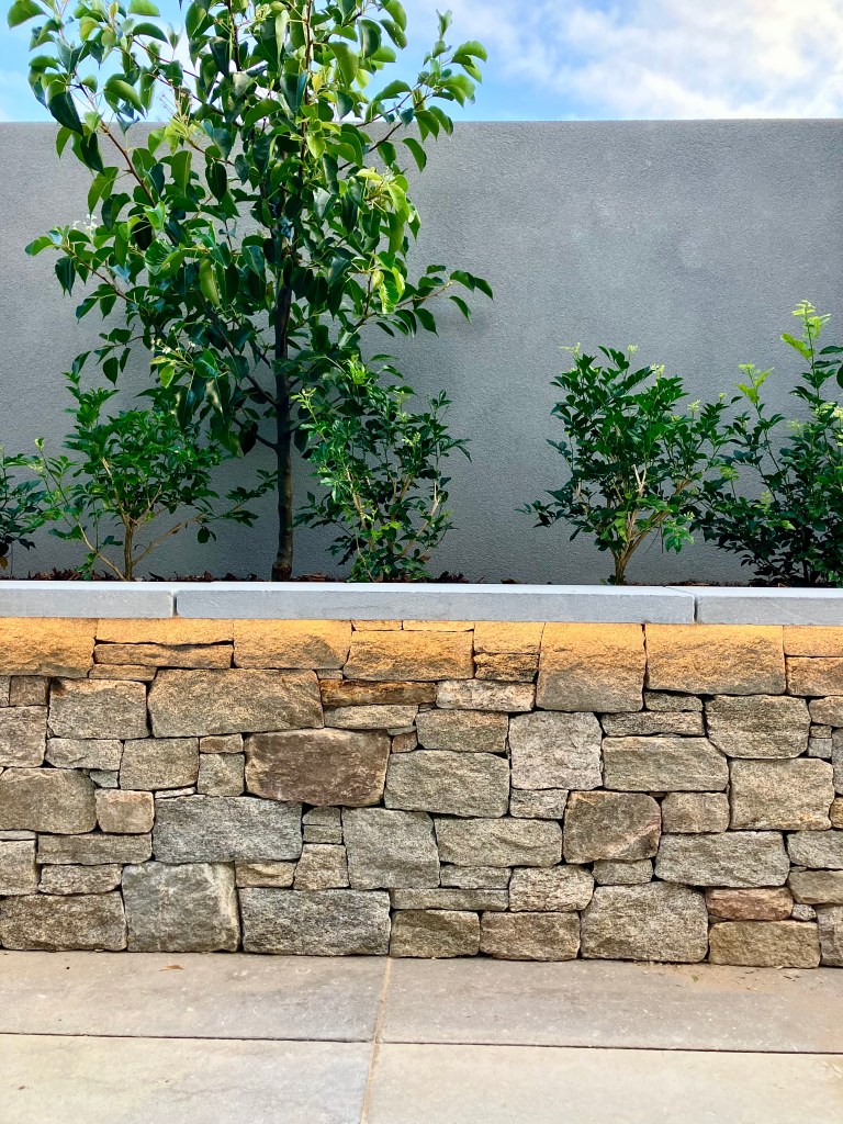 A full landscape build on this new Newtown build. The soft planting allows the natural stone to stand out in this practical, low mainten