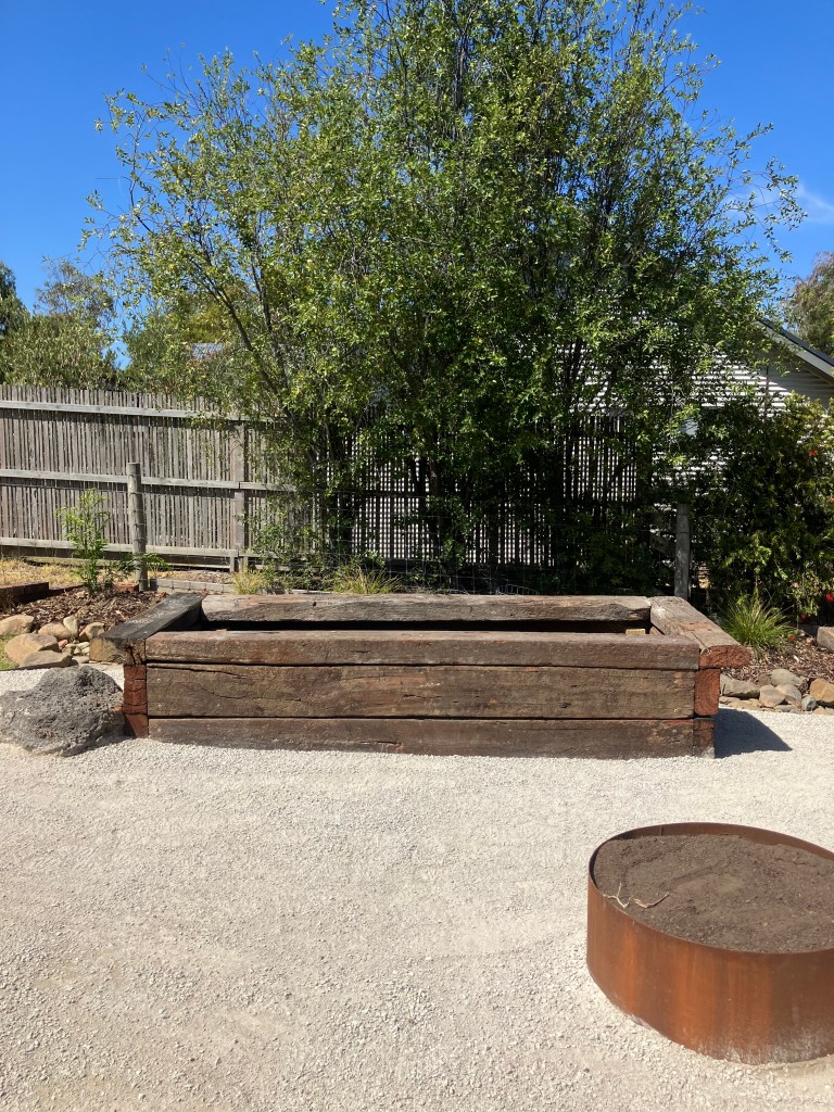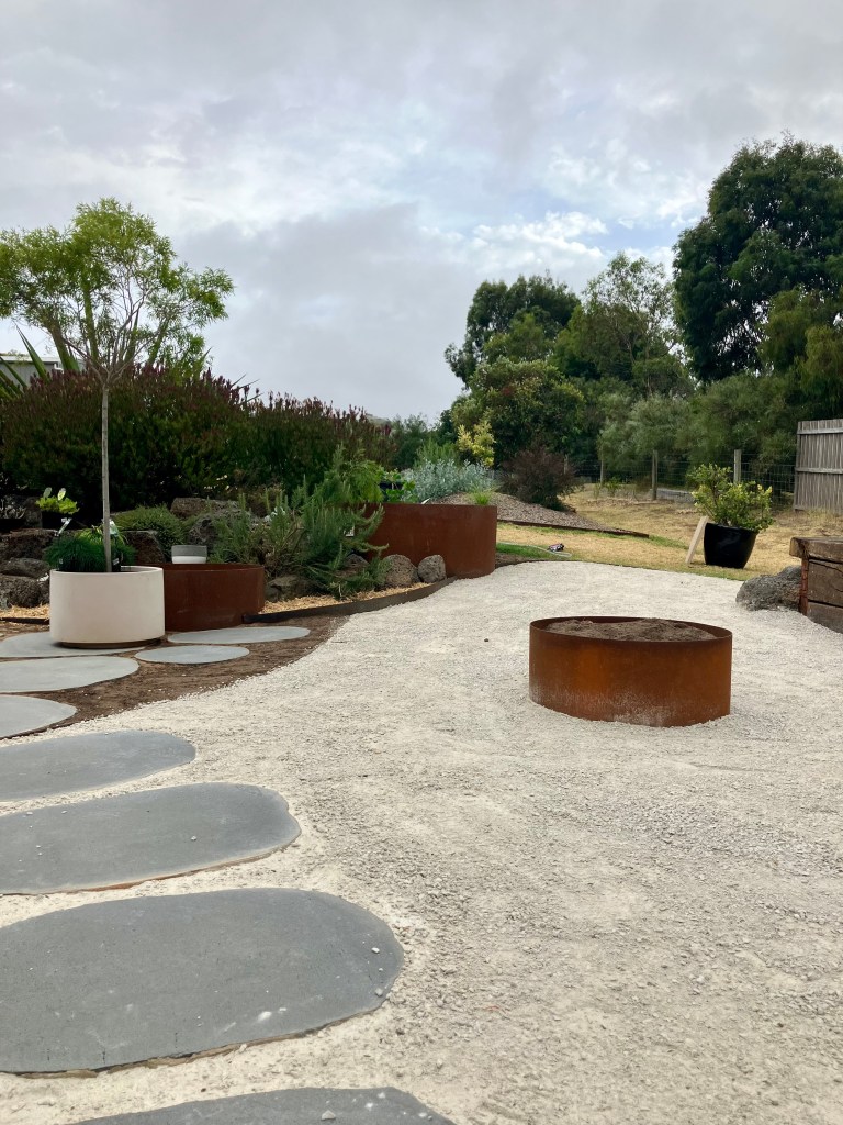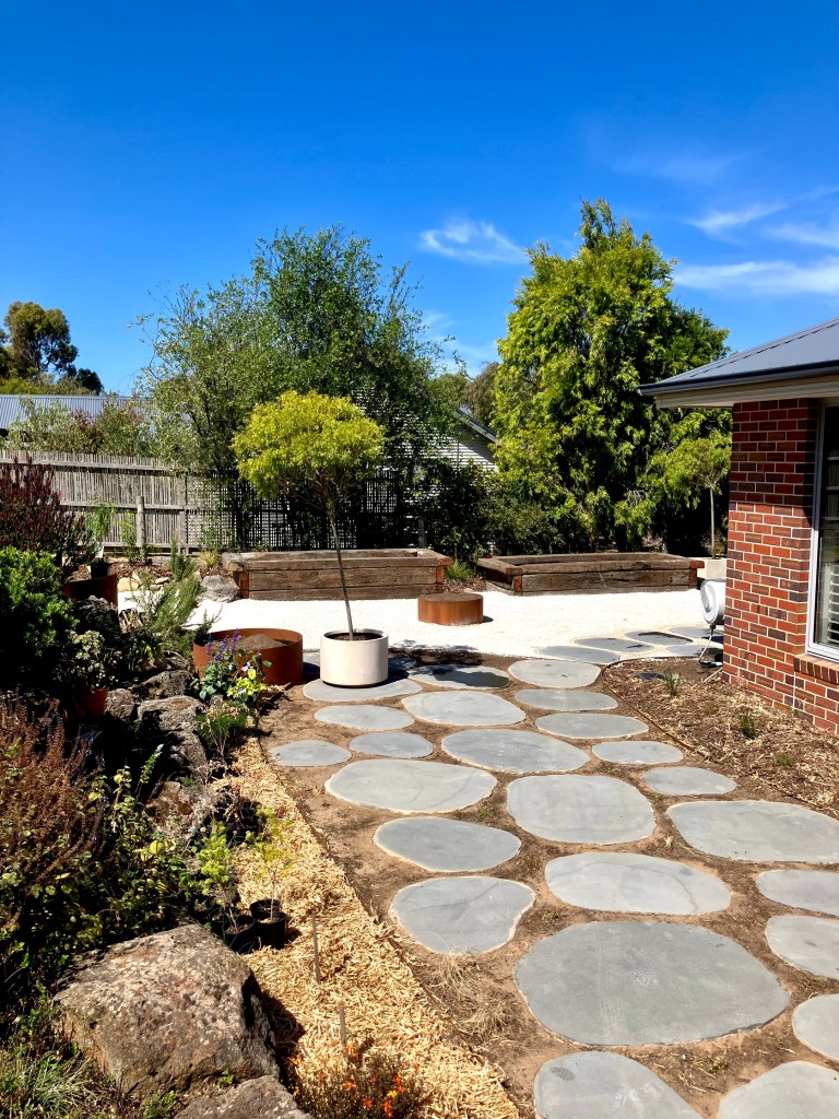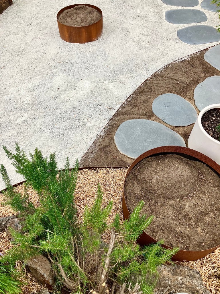 A native garden built on curves. This outdoor space was built to blend into the exisiting landscape of the yard with a strong focus on natural and recycled materials.